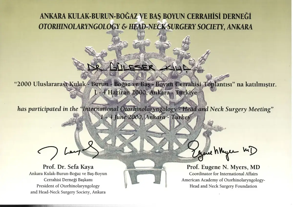 Ankara Kulak Burun Boğaz ve Baş Boyun Cerrahisi Derneği tarafından 01-04 Haziran 2000 tarihleri arasından düzenlenen “2000 Uluslararası Kulak Burun Boğaz ve Baş Boyun Cerrahisi Toplantısı”